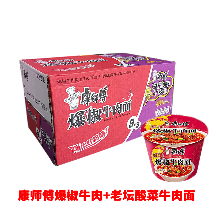 康师傅经典桶爆椒牛肉+老坛酸菜1*12